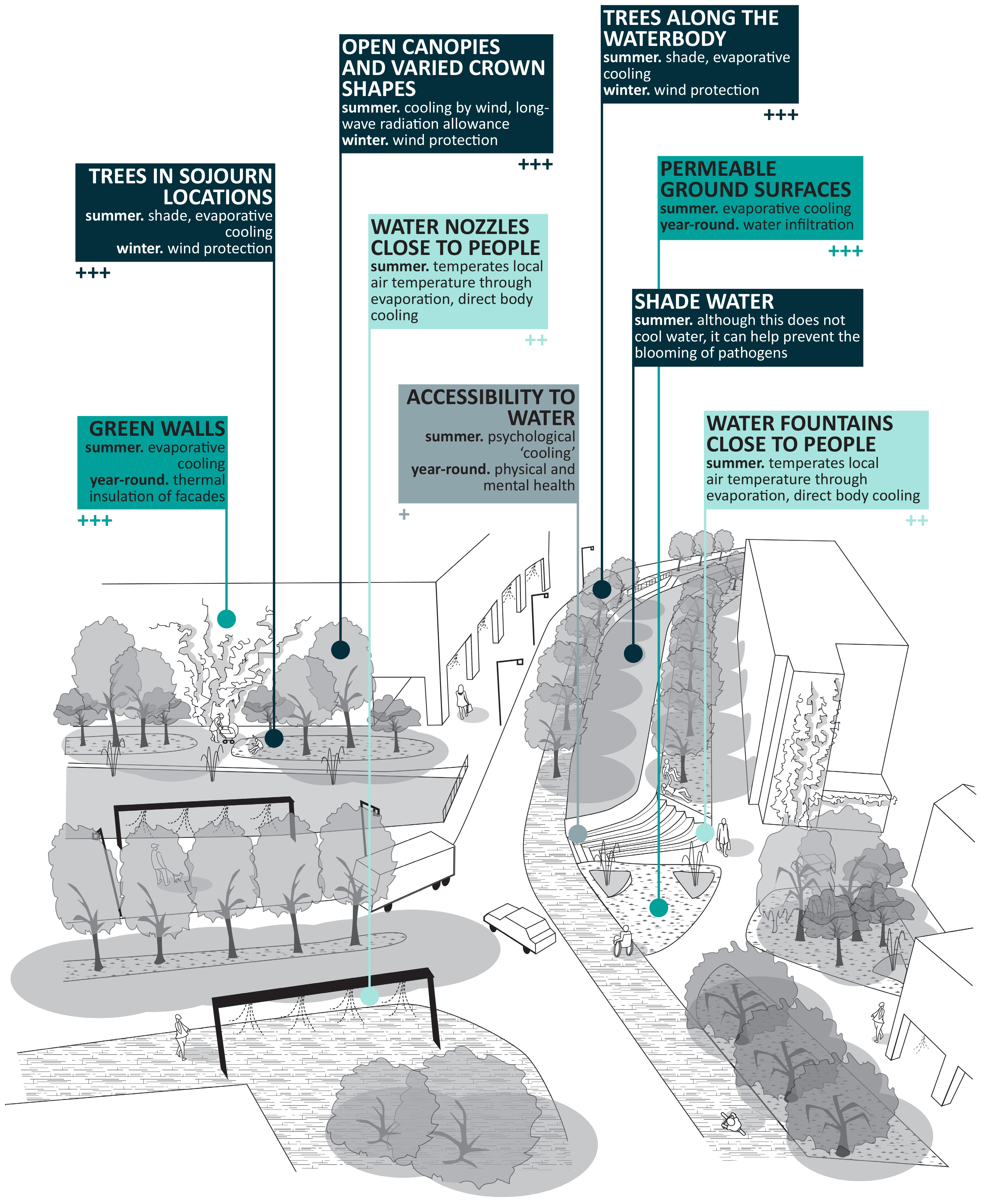 The role Wageningen University and Research plays in GreenQuays is that of contributing to the climate-responsiveness of the design proposal being developed by the design team of the municipality of Breda. The Landscape architecture (LAR) and the Meteorology and Air Quality Groups (MAQ) are collaborating with each other and with the other project partners in developing evidence on microclimatic aspects. The goal is to provide the design team with design principles targeted at achieving cooling effects. To this end, micrometeorological simulations and in situ measurements with meteorological stations are being undertaken by MAQ. Based on resulting data, LAR is developing the aimed climate-responsive design principles.