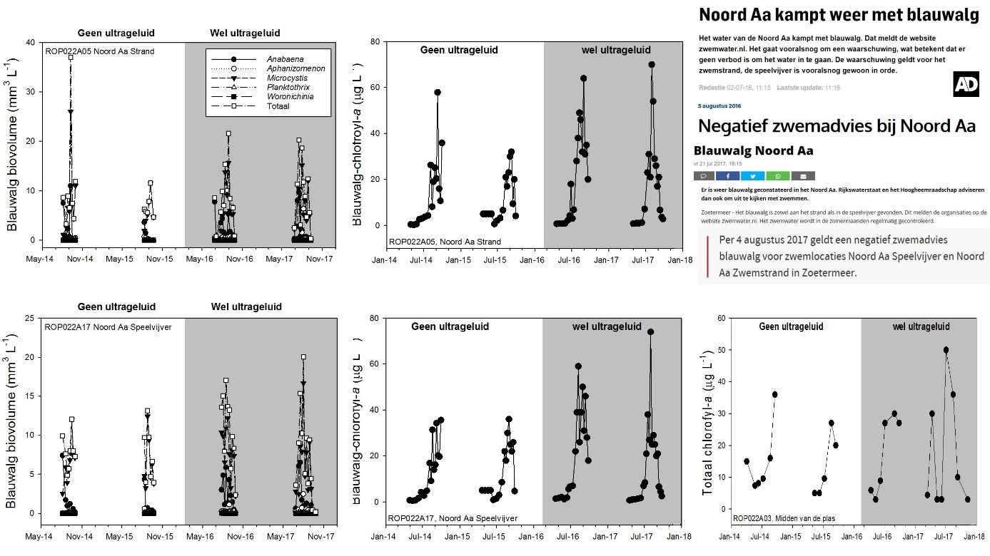 Een andere techniek is het gebruik van ultrageluid, waarbij met laag energetisch en lage-frequentie-ultrageluid gasblaasjes van blauwalgen in resonantie (trilling) worden gebracht, waarna de blauwalgen zouden zinken en sterven. De effectiviteit van deze methode is met wetenschappelijk onderzoek weerlegd (Lurling & Tolman, 2014; Lurling et al., 2014; 2016b). Diverse testen in het oppervlaktewater lieten geen verbetering van de waterkwaliteit zien (Kardinaal et al., 2008; Leßmann & Nixdorf, 2015). Ook het recente experiment in de Zoetermeerse Plas leverde geen bewijs voor een effectieve aanpak van de blauwalgenoverlast.