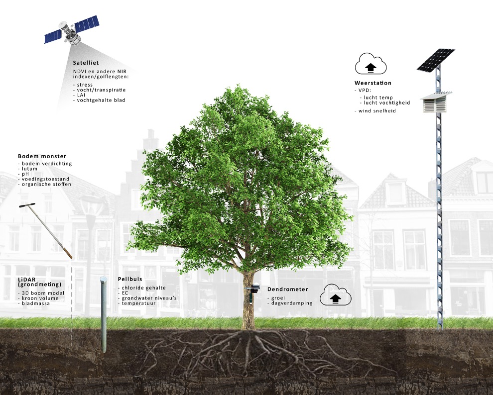- Een KPI boomvitaliteit. Deze techniek dient te leiden tot een applicatie waarmee real time de vitaliteit van een individuele boom inzichtelijk wordt.