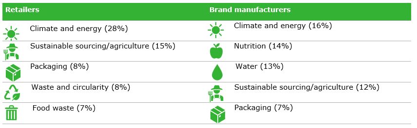 In totaal was meer dan de helft van de verbintenissen van retailbedrijven (66%) en merkfabrikanten (62%) gericht op vijf duurzaamheidskwesties. Dit laat zien dat voedingsbedrijven gemeenschappelijke prioriteiten lijken te hebben – waarbij ‘klimaat en energie’ bovenaan de lijst staan.