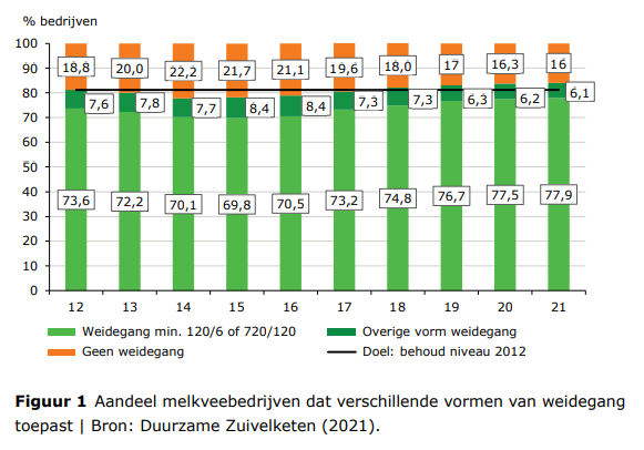 Het voor 2030 geformuleerde doel is dat minimaal 81,2% van de bedrijven (gebaseerd op nulmeting in 2012) een vorm van weidegang toepast. Dit doel is in 2021 voor het vierde jaar op rij gerealiseerd. In 2018 paste 82,0% van de bedrijven een vorm van weidegang toe, in 2019 83,0%, in 2020 83,7% en in 2021 nam dit verder toe tot 84,0% (figuur 1).
