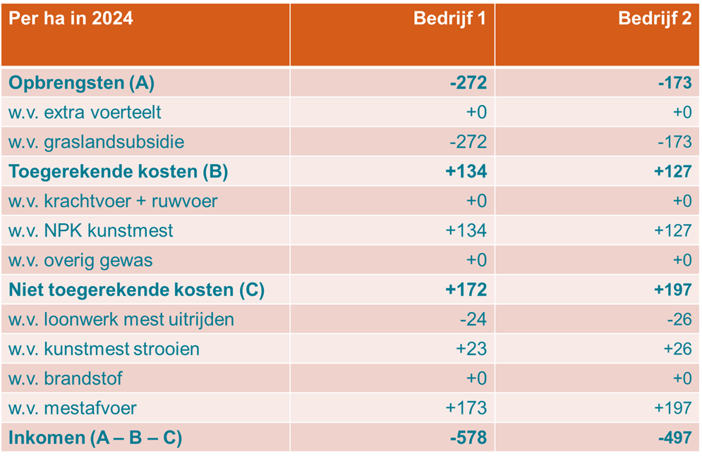 - De graslandsubsidie, die bij derogatie kan worden aangevraagd, vervalt op beide bedrijven wanneer geen gebruik wordt gemaakt van derogatie. Op bedrijf 1 is de graslandsubsidie per hectare hoger dan op bedrijf 2, omdat op de mestplaatsingsruimte in 2024 lager was dan op bedrijf 2. Dit berdrag kan worden beschouwd als compensatie van verlaging gebruiksnormven 2024 ten opzichte van gebruiksnorm van 250 kg N per hectare die nog in 2022 gold.