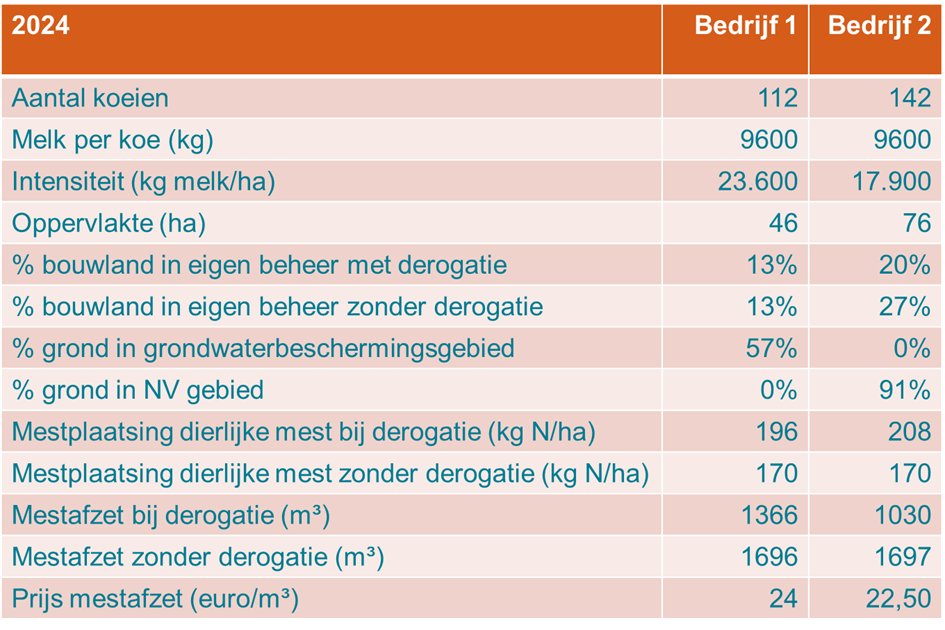In tabel 1 zijn een aantal globale kengetallen van de beide pilotbedrijven weergegeven voor 2024.e