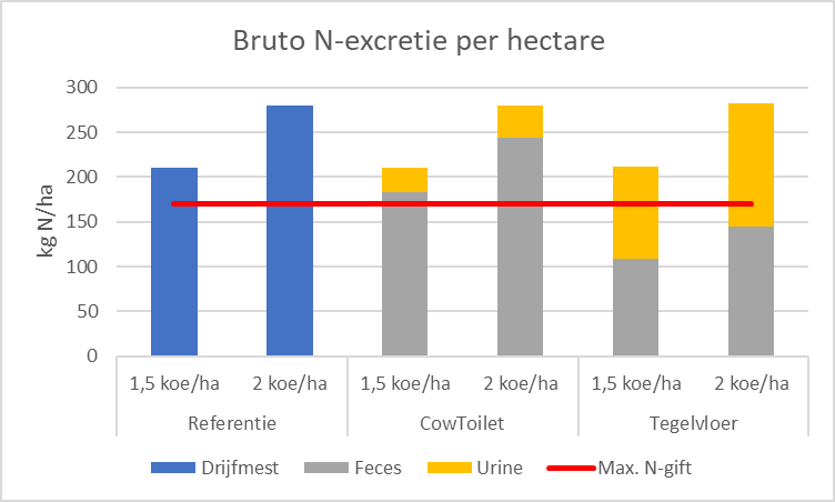 De bruto N-excretie vanuit de drijfmest of de feces bij mestscheiding boven de 170 kg per ha moet afgevoerd worden. Dit is weergegeven in figuur 1 bij 1,5 en 2,0 koeien per ha voor zowel CowToilet als Tegelvloer.