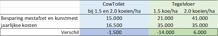 In tabel 1 is het verschil tussen jaarlijkse baten en kosten weergegeven voor een bedrijf met 100 koeien. Bij gebruik van de doorlaatbare Tegelvloer is onderscheid gemaakt tussen 1,5 en 2,0 koeien per ha, omdat bij 2 koeien per ha aanzienlijk meer op mestafzetkosten bespaard kan worden.