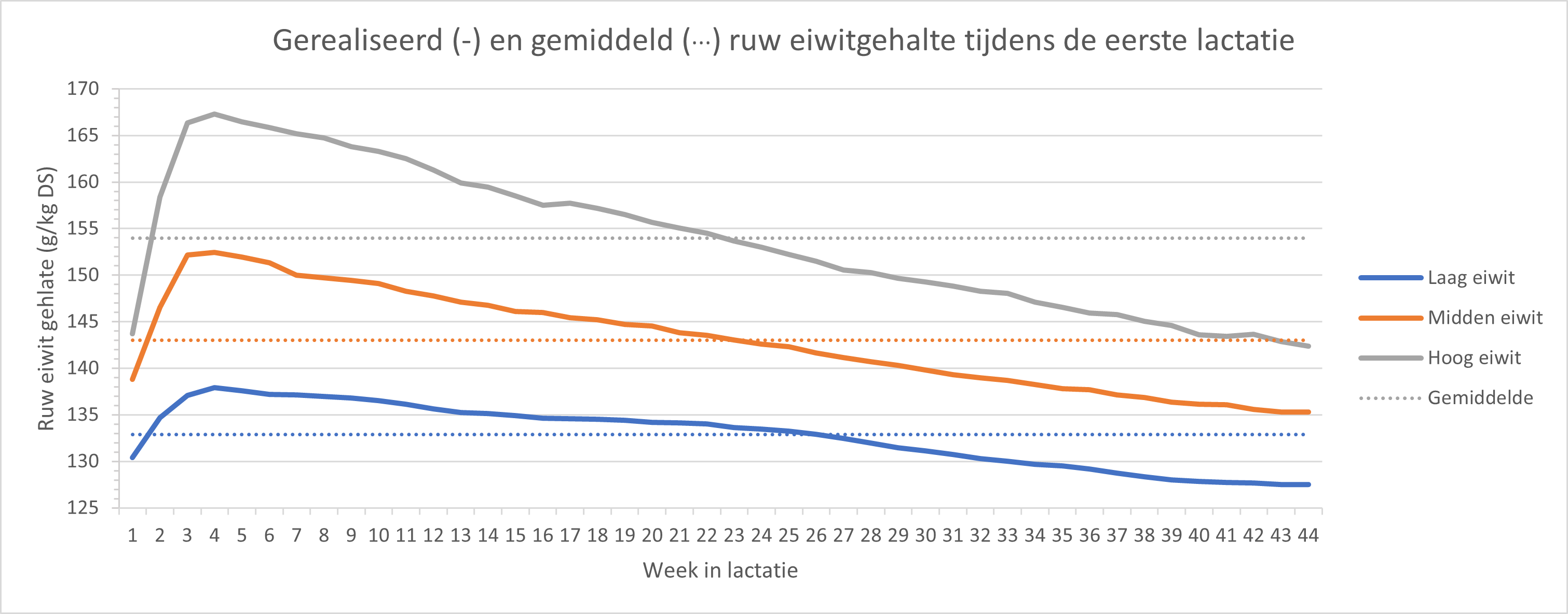 De praktische uitvoering van het onderzoek is succesvol afgerond. Het is gelukt om het basisrantsoen en de krachtvoersoorten in samenstelling én kwaliteit relatief stabiel te houden over de hele onderzoeksperiode. Tevens is het gelukt om drie verschillende eiwitniveaus te voeren, met gerealiseerde lactatie-gemiddelden van respectievelijk 15.4, 14.3 en 13.3% RE (afbeelding 2). Door een hogere opname van het basisrantsoen door de koeien in m.n. de hoogste twee eiwit groepen vielen de gerealiseerde eiwitgehaltes voor deze twee groepen wat lager uit dan vooraf uitgerekend. Desondanks bleven verschillen tussen de groepen behouden.