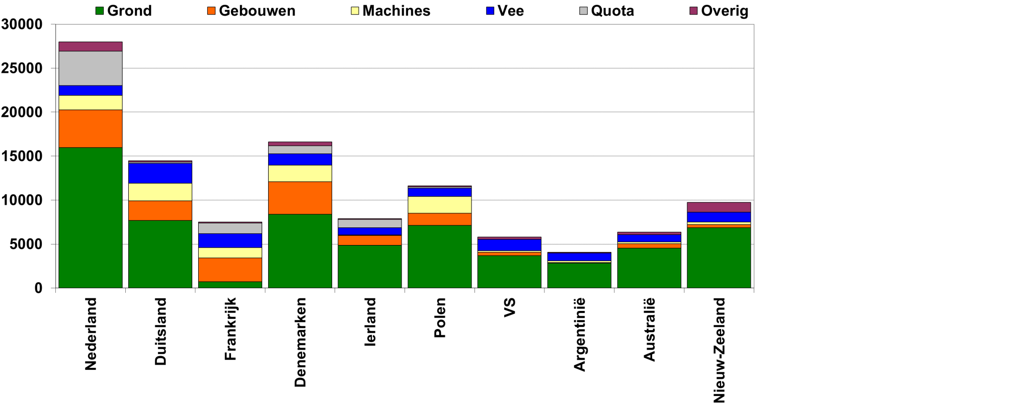 De melkveebedrijven in Nederland zijn het meeste waard. Dit blijkt uit figuur 1. Hier is te zien dat de waarde van de Nederlandse bedrijven hoger liggen dan e waarde van het aanwezige kapitaal op representatieve bedrijven in de andere belangrijke zuivellanden. Per koe is een melkveebedrijf in Nederland ongeveer € 28.000,- waard. Er dan uitgegaan van de boekwaarde van machines en gebouwen en van de marktwaarde van overige kapitaalsbestanddelen in 2014, zoals grond en vee. Op een typisch Nederlands melkveebedrijf is gemiddeld voor ruim € 15.000 per koe in grond vastgelegd. In andere belangrijke zuivellanden is de marktwaarde van de aanwezige grond veel lager.
