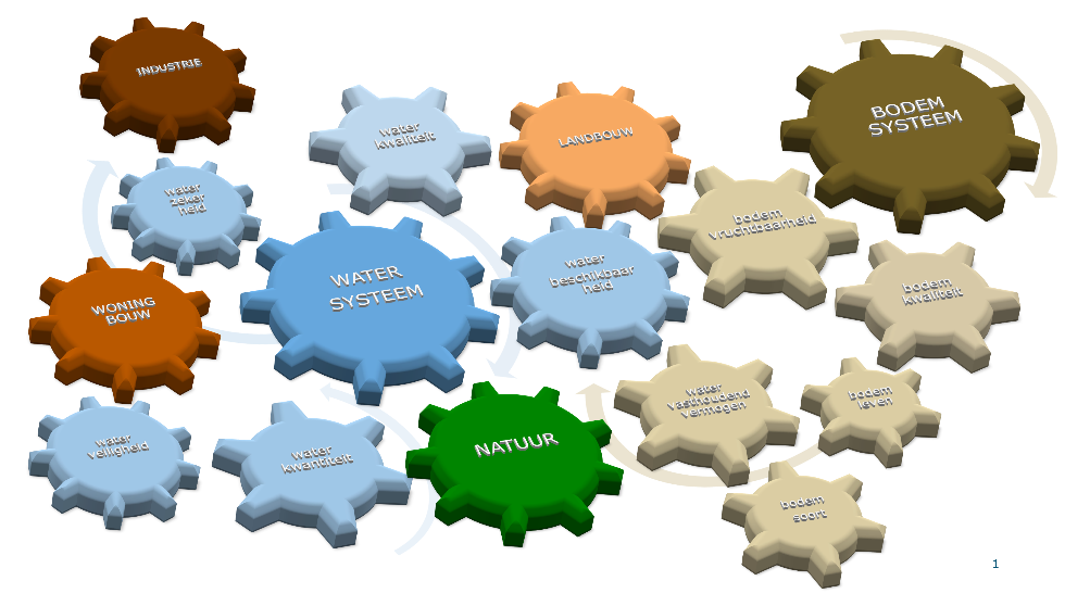 Spreek je over water, dan kun je denken aan het oppervlaktewatersysteem of het grondwatersysteem, maar ook aan waterzekerheid en waterveiligheid. De begrippen ‘bodem’ en ‘water’ vertegenwoordigen dus veel verschillende deelsystemen, die onderling nauw samenhangen. Bovendien worden deze deelsystemen ook bepaald door hoe we het land gebruiken, én spelen ze daarin zelf een bepalende rol.