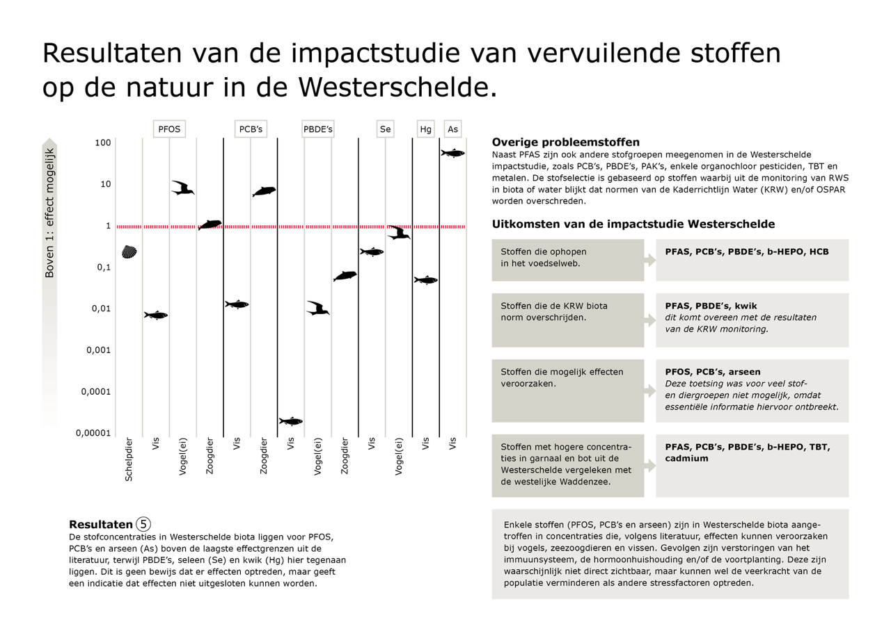 Uit de studie blijkt dat van de gemeten stoffen PFAS de belangrijkste probleemstof is voor het ecosysteem van de Westerschelde. Deze stoffen hopen zich op in het voedselweb en overschrijden zowel de biotanormen van de KRW als de gerapporteerde effectgrenzen. De PFAS-concentraties in Westerschelde-biota zijn significant hoger dan in de Waddenzee. Andere stoffen, zoals PCB’s en PBDE’s, hopen zich ook op en komen in relatief hoge concentraties voor in de Westerschelde. Voor deze stoffen zijn echter al eerder maatregelen getroffen om nieuwe inbreng te voorkomen. Volgens Thijs Poortvliet, senior adviseur waterbeheer bij Rijkswaterstaat, is de waterkwaliteit van de Westerschelde nog niet op alle fronten op orde. Daarom heeft Rijkswaterstaat de effecten op dieren die in het water leven laten onderzoeken. ‘Dit unieke project geeft waardevolle inzichten in de toestand van het ecosysteem. De resultaten helpen om maatregelen om vervuiling verder terug te dringen te prioriteren in binnen- en buitenland’, vertelt Poortvliet.