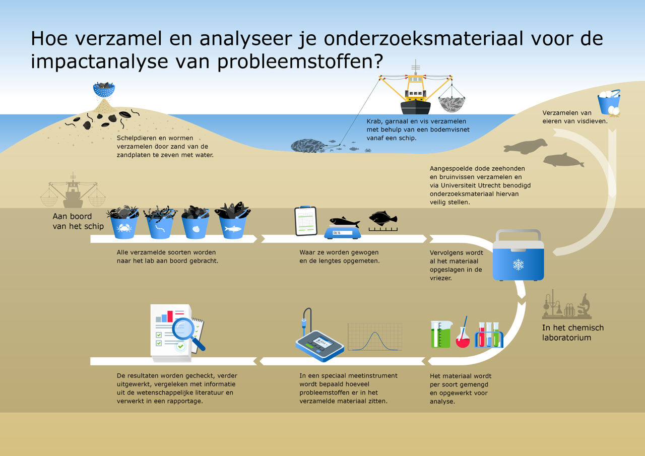 In 2023 zijn ongeveer honderd monsters verzameld van verschillende diersoorten uit de Westerschelde, waaronder drie toppredatoren, hun prooidieren (garnalen en verschillende vissoorten) en lagere prooisoorten zoals schelpdieren en wormen. Deze monsters geven een representatief beeld van het voedselweb. In de monsters zijn verschillende chemische probleemstoffen geanalyseerd, en de resultaten zijn vergeleken met die van de westelijke Waddenzee, waar eveneens materiaal werd verzameld. Daarnaast werd gekeken naar historische data (2006-2008) om veranderingen in de tijd vast te stellen. De gehalten werden vergeleken met de biotanormen van de Kaderrichtlijn Water (KRW) en grenswaarden voor effecten op de diergroepen, op basis van literatuuronderzoek.
