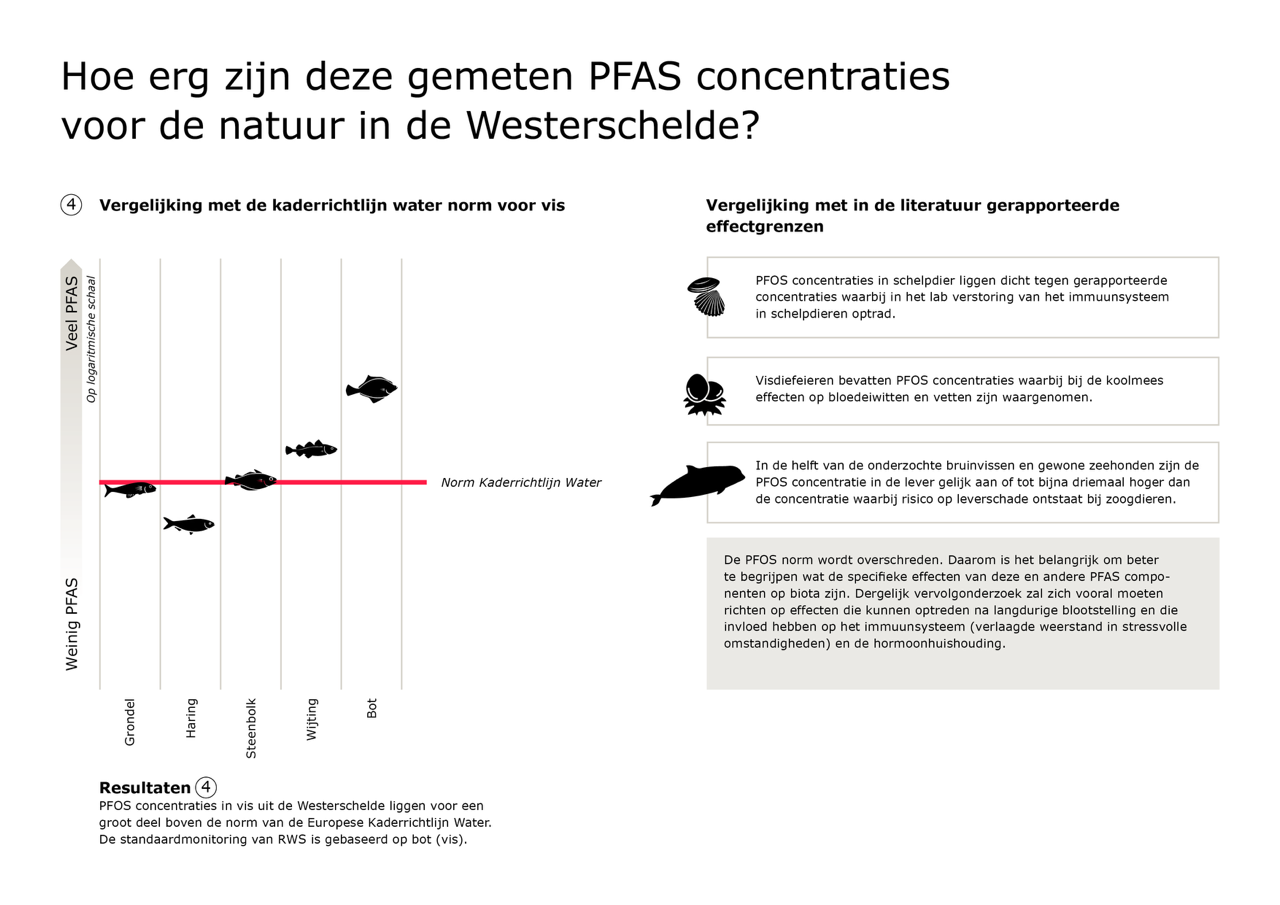 De studie bevestigt dat het monitoren van PFAS in bot (platvissoort), zoals nu gebruikelijk is, effectief is voor het beoordelen van de situatie in de Westerschelde, aangezien bot de hoogste concentraties bevat in vergelijking met andere vissoorten. Om beter te kunnen vergelijken met gegevens uit andere landen, wordt aanbevolen om ook garnalen op te nemen in het monitoringsprogramma.