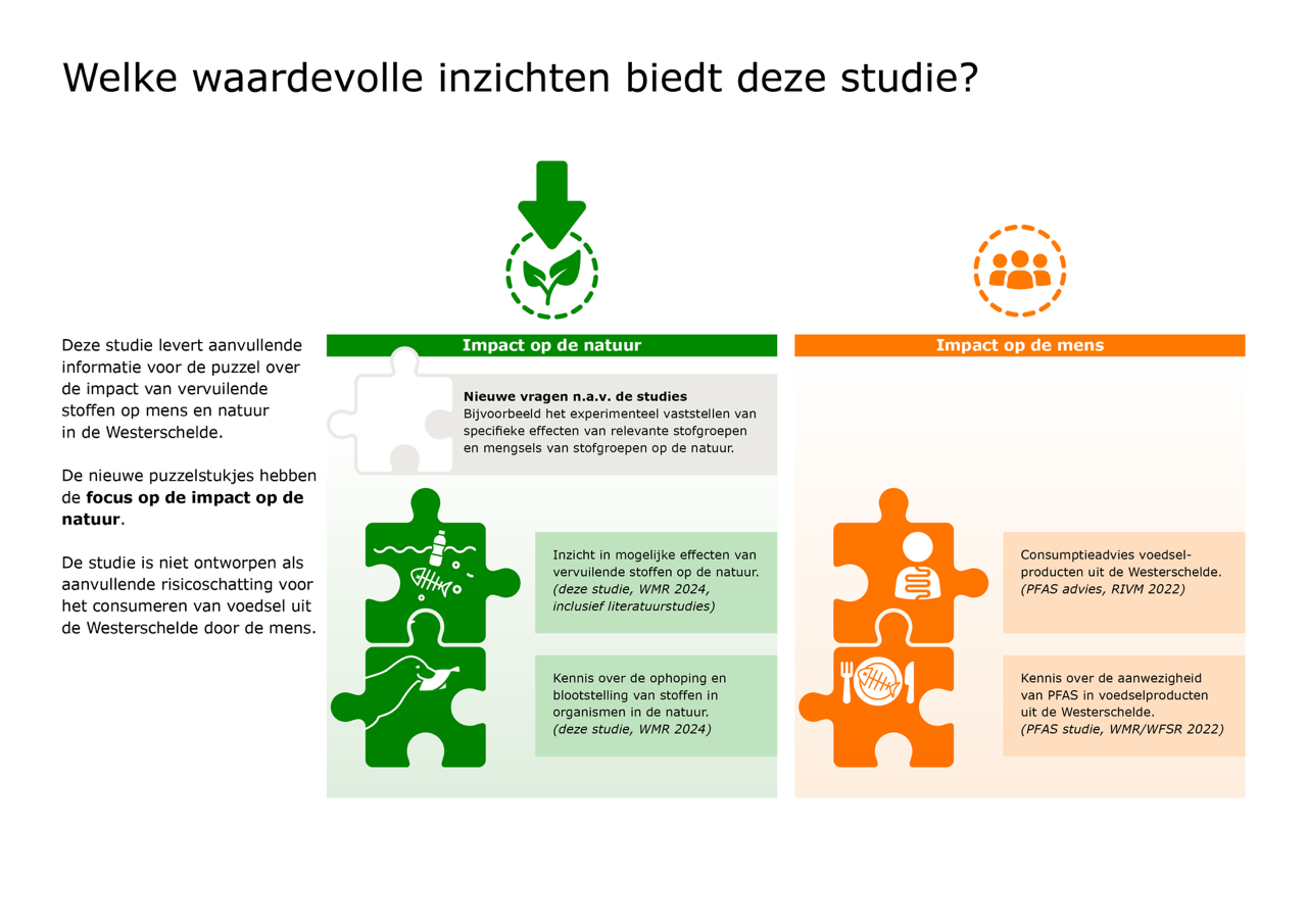 Het Westerschelde-estuarium is een complex ecosysteem dat onder hoge druk staat door chemische stoffen zoals PFAS, polychloorbifenylen (PCB’s), gebromeerde vlamvertragers (PBDE’s), tributyltin (TBT) en kwik. De impact van deze stoffen op de gezondheid van het bredere ecosysteem was tot voor kort onvoldoende onderzocht. De recente studie vult dit kennisgat gedeeltelijk in. De effecten van PFAS zijn niet direct zichtbaar in de natuur, maar kunnen het immuunsysteem en de hormoonhuishouding van dieren verstoren. 'Hoewel deze effecten subtiel zijn, kunnen ze op lange termijn de veerkracht van populaties verminderen, bijvoorbeeld tegen bedreigingen zoals virussen en klimaatverandering', aldus Martine van den Heuvel-Greve, marien bioloog bij Wageningen Marine Research.