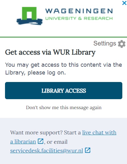Click on the orange Log in button at the top of the Library homepage, and log in with your WUR account. Continue your search in WUR Library Search via the search box or in specific databases to get access to articles and e-books. You don't need special software or specific settings.