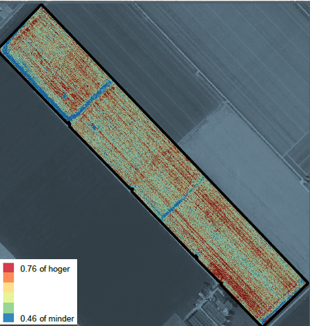 Op 22 mei is de biomassa meting uitgevoerd, die op de foto is weergegeven. De verschillen in gewasontwikkeling binnen het perceel zijn best groot van deze 2e snee, waarvan de groei stagneerde door de aanhoudende droogte. De rode kleur markeert de hoogste biomassa, de blauwe kleur de laagste. Duidelijk zijn de kopakkers waarneembaar. Door verdichting van de bouwvoor blijft hier de grasgroei achter en kan hier de bemesting wel worden aangepast naar de grasproductie. Op de onbemeste proefveldjes in het middelste en achterste perceel blijft de grasgroei ook verklaarbaar achter.