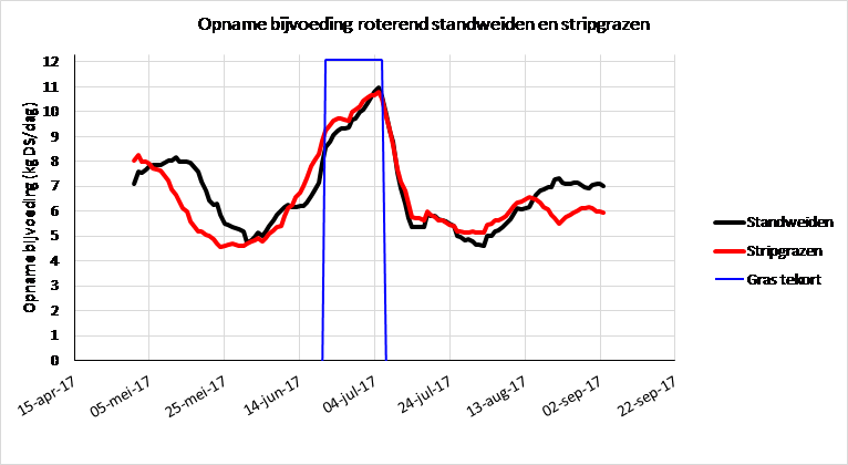 In het beweidingsonderzoek op Dairy Campus is de hoeveelheid bijvoeding bepaald door het grasaanbod. Een belangrijk criterium daarbij is de grasvoorraad. Deze is bepaald tijdens een wekelijks Farmwalk. Tijdens deze wandeling is een inschatting gemaakt van de kwantiteit, op basis van beschikbare kilogrammen droge stof, en kwaltiteit, waarbij gelet is op bossigheid en doorschieten. Daarnaast is bij het stripgrazen gestuurd op zo'n klein mogelijke weiderest. Omdat de grasvoorraad zich bij roterend standweiden en stripgrazen verschillend ontwikkelde, ontstonden er ook verschillen in de opname van bijvoeding (zie figuur). Doelstelling was om gemiddeld 6 kilogram droge stof uit eiwitarme bijvoeding (snijmais) te verstrekken aangevuld met 6 kilogram krachtvoer met respectievelijk 100 DVE met -50 OEB; 100 DVE met +50 OEB of 140 DVE met +50 OEB).