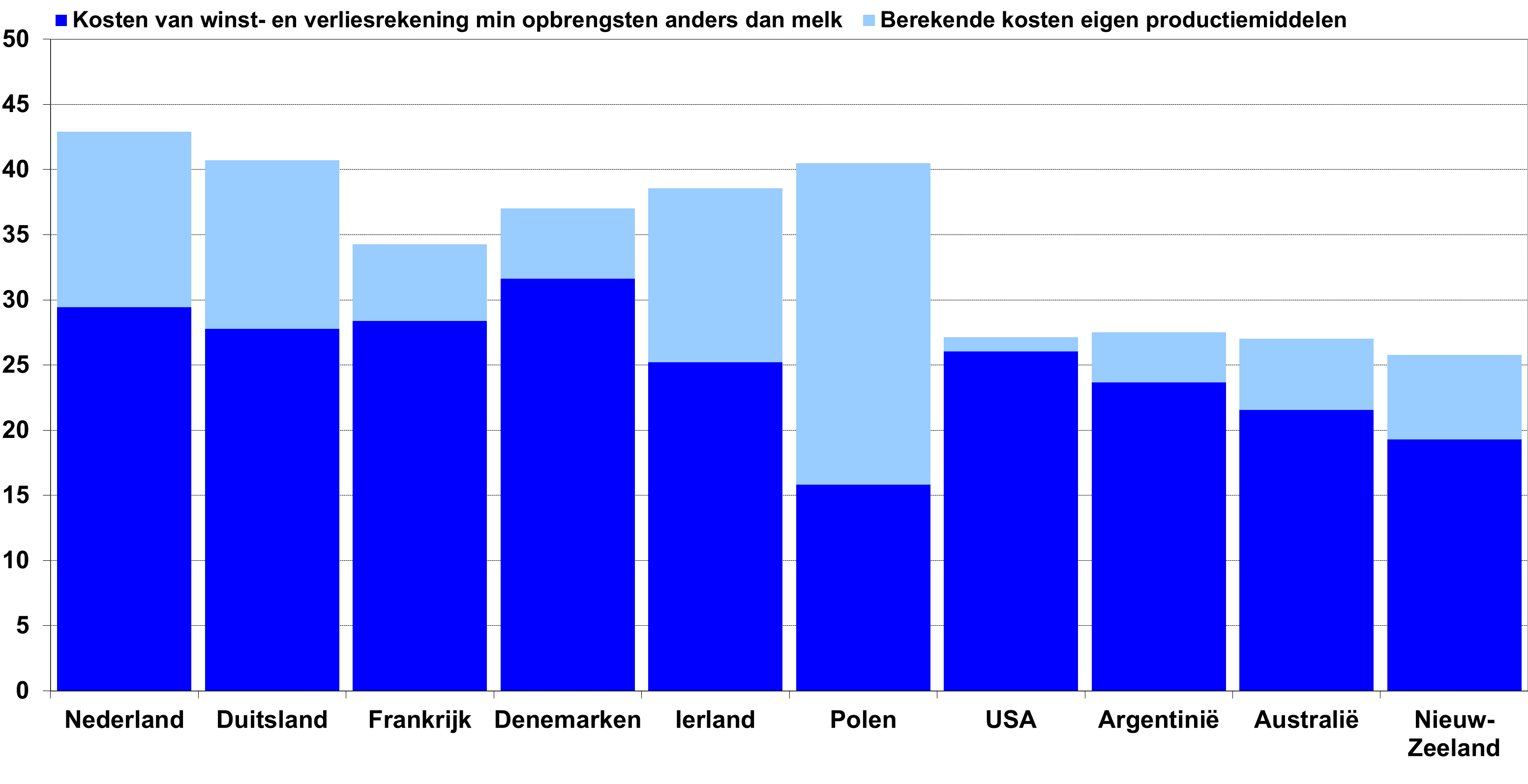 In vergelijking met andere belangrijke zuivellanden is de kostprijs van melk op een typisch Nederlands melkveebedrijf hoog. Alleen in Duitsland en Polen komt deze met ongeveer 40 cent per kg melk in de buurt. Van andere belangrijke zuivellanden binnen Europa heeft Frankrijk met iets meer dan 34 cent de laagste kostprijs. In dit land wijkt de kostprijs van melk niet veel af van de verkregen melkprijs en worden de berekende kosten wel vergoed.