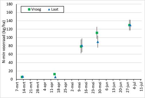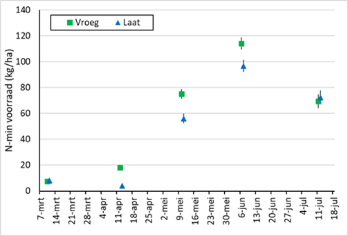 In figuur 2 is het verloop van de minerale stikstof voorraden (N-min) in de bodemlaag 0-60 cm te zien . van vroeg (begin maart) en laat (begin april) vernietigen van het vanggewas. In 2021 waren er geen duidelijke verschillen tussen het vroeg en laat vernietigen van het vanggewas. Daarentegen waren de hoeveelheden bodem N-mineraal van de behandelingen met vroege vernietiging in 2022, duidelijk groter (15-20 kg N per ha) dan die van de behandelingen met late vernietiging. Waarschijnlijk komt dit door de relatief hoge temperaturen in het vroege voorjaar, terwijl de temperaturen in 2021 in diezelfde periode, lager dan gemiddeld waren.