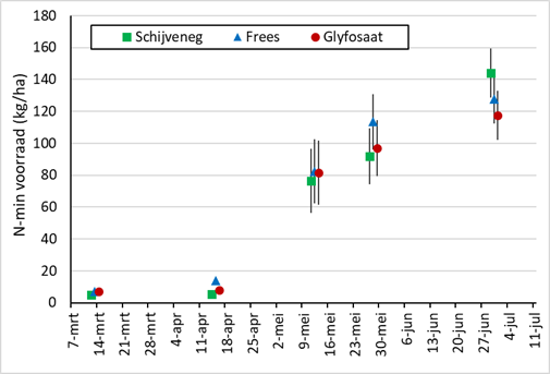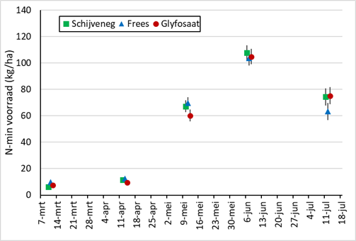 In figuur 1 is het verloop van de minerale stikstofvoorraden (N-min) in de bodemlaag 0-60 cm weergegeven van de verschillende vernietigingsmethoden. In zowel 2021 als in 2022 zaten er geen noemenswaardige verschillen in de hoeveelheden minerale stikstof. In beide jaren was de hoeveelheid bodem N-mineraal in de periode maart-april laag, minder dan 15 kg per ha. In 2021 steeg de hoeveelheid bodem N-mineraal tot 130 kg per ha eind juni, in begin juni 2022 tot ca. 105 kg per ha, waarna deze vervolgens tot begin juli daalde tot ca. 70 kg per ha.